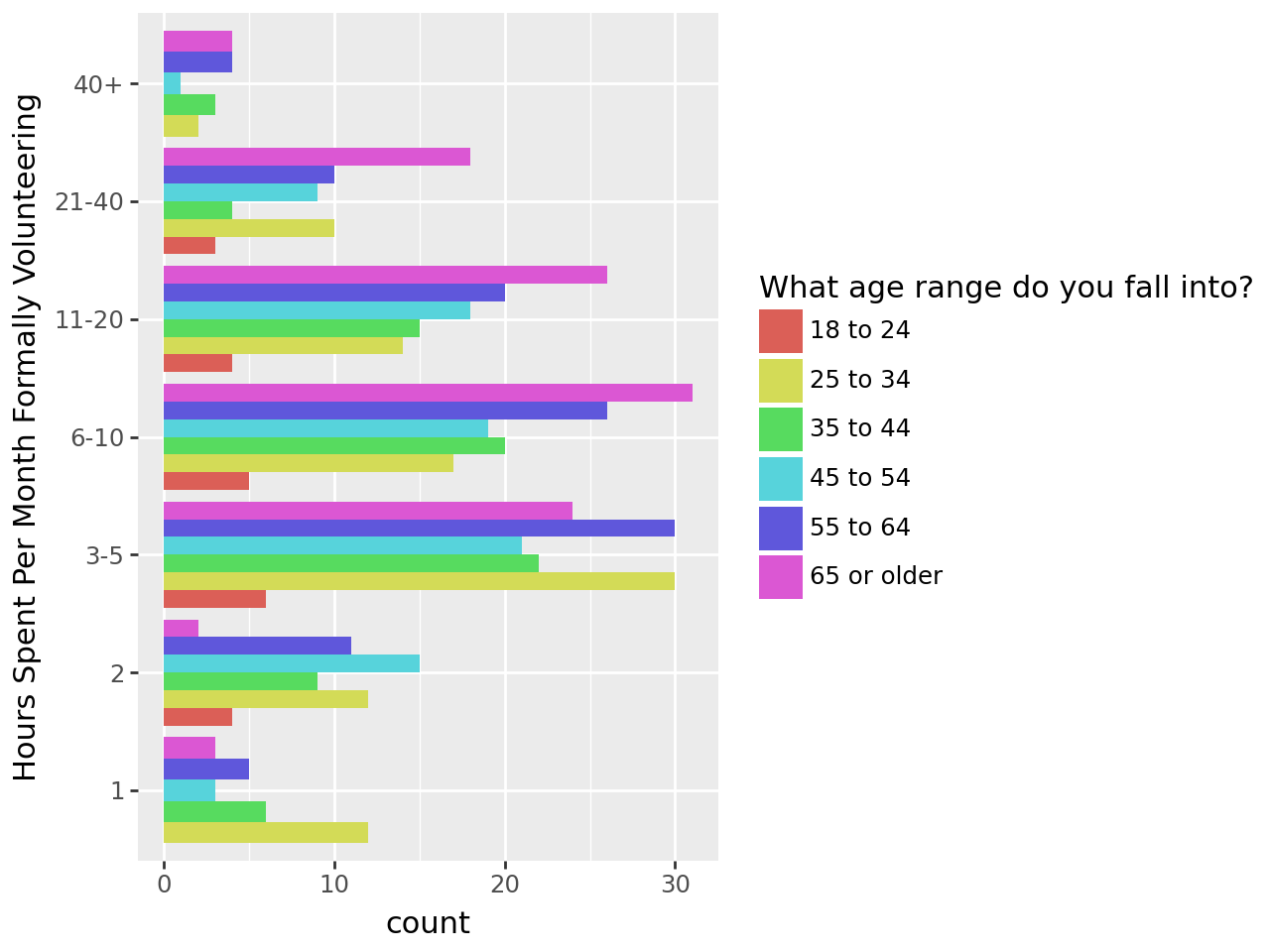Note: the 18-24 range cannot be used to predict or determine anything about their volunteering rates As expected, senior individuals volunteer the most hours per month. The older an individual becomes, the longer they will spend volunteering. Younger groups, such as 25 to 34-year-olds, volunteer the fewest hours per month, which is to be expected as individuals under 55 will have less time than those who are retired.